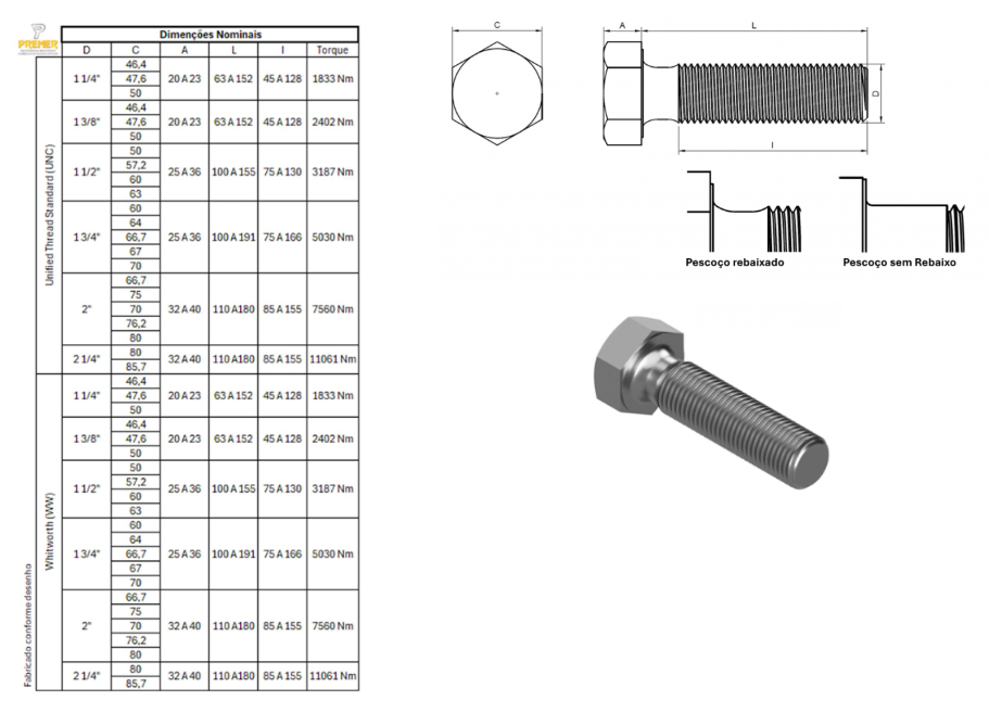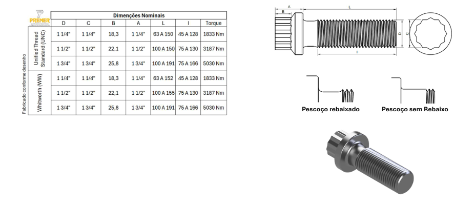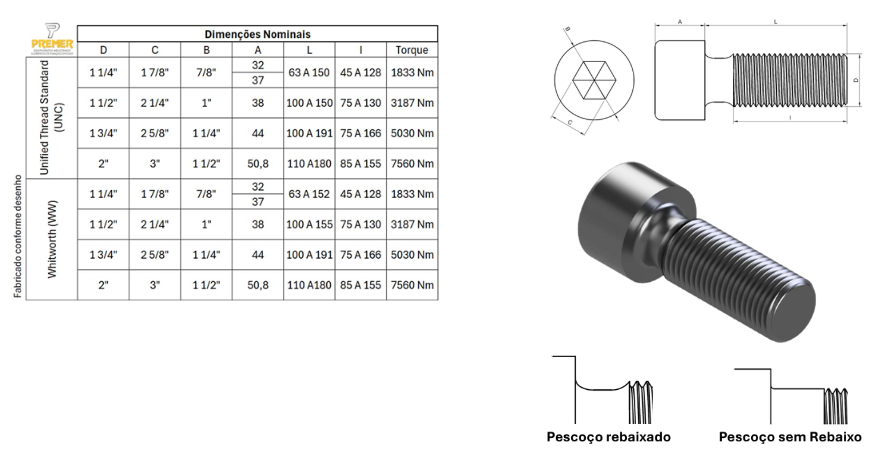 O design sextavado é uma preferência comum nas usinas devido à facilidade de aplicação e à compatibilidade com uma ampla gama de ferramentas de manutenção, facilitando o aperto e o torque necessários para uma fixação segura. Este parafuso também passa por um rigoroso controle de rastreabilidade assim como todos os produtos Premer, desde a seleção da matéria-prima até cada etapa do processo de fabricação. Essa rastreabilidade assegura um padrão de qualidade elevado, permitindo que qualquer lote seja identificado e monitorado, reforçando a confiabilidade do produto. Produto fabricado conforme tabela e conforme desenho. Essa linha de produto acompanha certificados de qualidade.